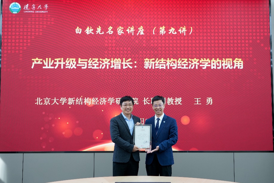 第十四届全国人大代表,辽宁省第十四届人大常委会委员,bb贝博艾弗森官方网站党委副书记、董事长余淼杰教授出席报告会并致欢迎辞。致辞中,余淼杰董事长向在座师生隆重地介绍了王勇老师。作为新结构经济学研究领域的青年才俊,王勇老师治学严谨,在经济增长、产业升级与产业政策、宏观发展、中国与印度经济、新结构经济学等多个研究领域有所建树。在学术建设方面,秉承强烈的责任意识和担当精神,他与林毅夫教授一同致力于构建中国自主知识体系,尤其在新结构经济学方面做了一系列努力和尝试,积极推动我国经济学领域原创性思想的生产,为繁荣发展中国经济学话语体系研究做出了卓越贡献。此外,王勇老师期参与并负责多项国家重大研究课题以及重点经济学教材编译工作,主持或参与多项教育部重大攻关项目、国家社科重大与重点项目、国家自科重点项目,以及中财办、国家发改委、商务部、中宣部等多部政策课题,并获得党和国家领导人批示,为中央提供决策治理支持,上达天听,为推动国家治理现代化做出了切实贡献。余淼杰董事长为王勇老师担任bb贝博艾弗森官方网站客座教授表达了热烈欢迎与诚挚感谢,并为王勇老师颁发白钦先名家讲座纪念证书和bb贝博艾弗森官方网站客座教授聘书。